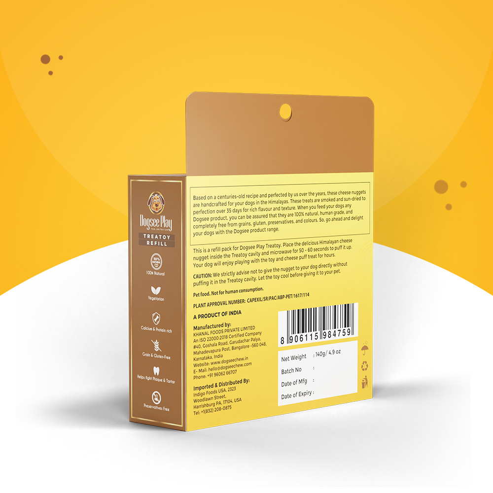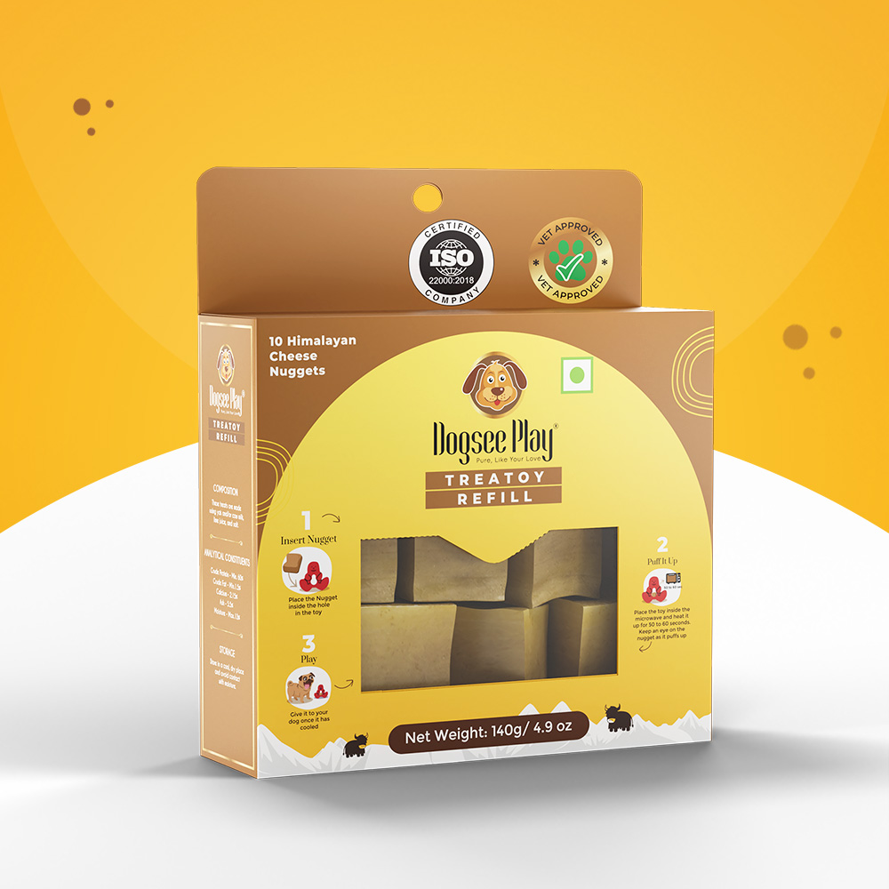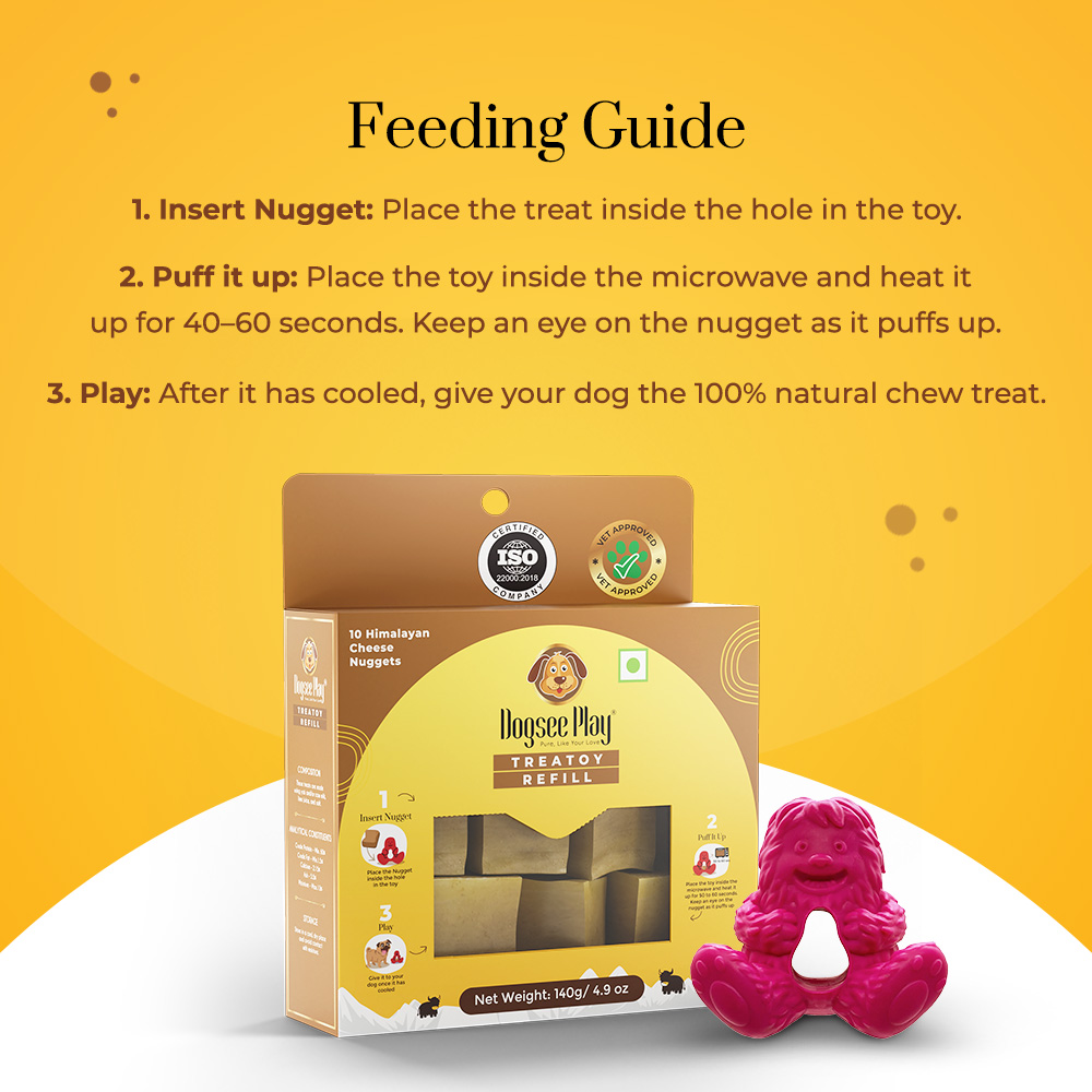 Place the delicious Himalayan cheese nugget inside the Treatoy cavity and microwave for 50-60 seconds to puff it up. Once cooled, give it to your dog and watch your pooch enjoy playing with the toy and cheese puff treat for hours.