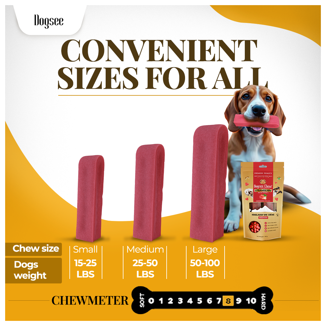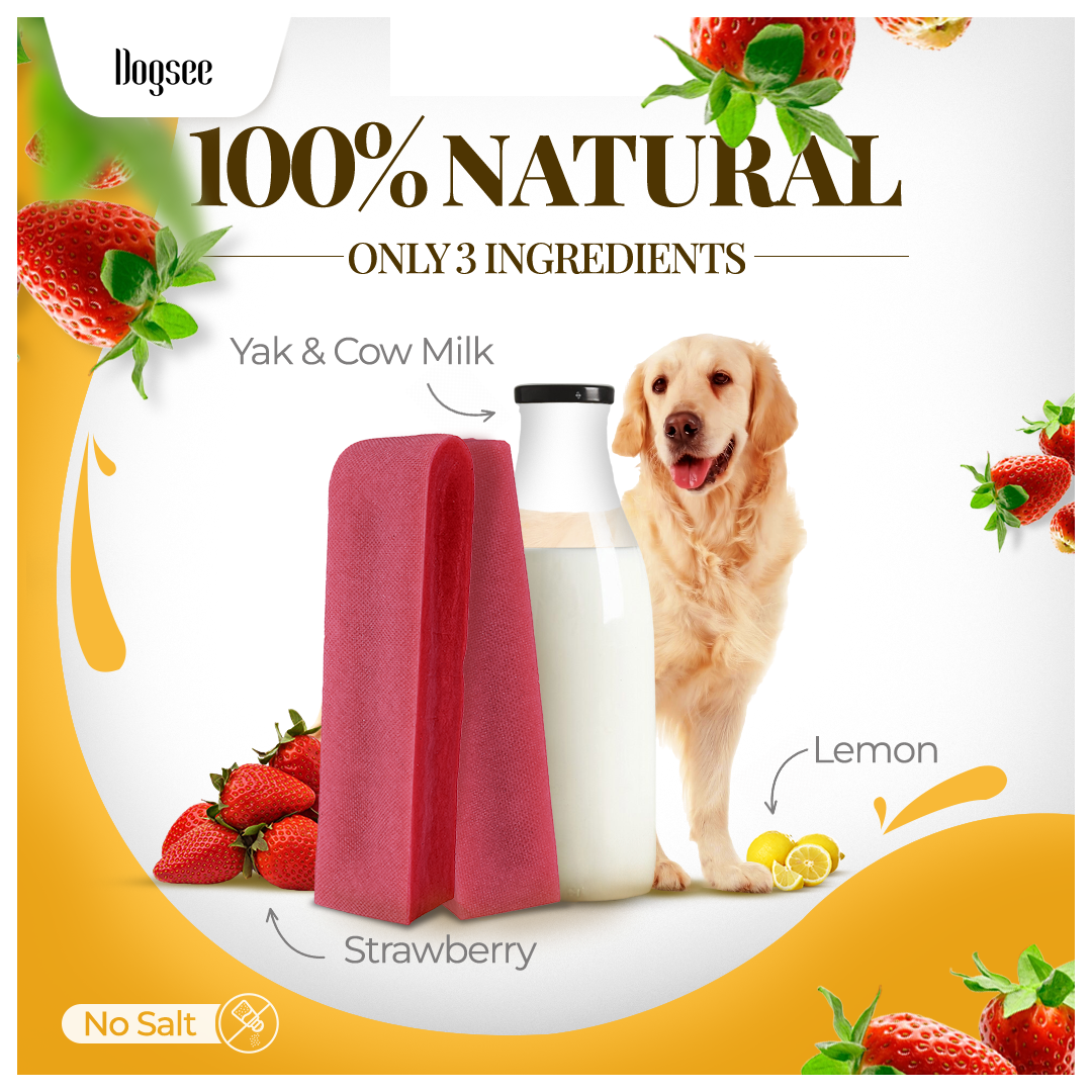 Strawberry Infused Yak Chews: Made from yak and cow milk, these medium chews are enhanced with real strawberry, offering a nutrient-rich, flavorful treat that supports your dog’s immune system naturally.