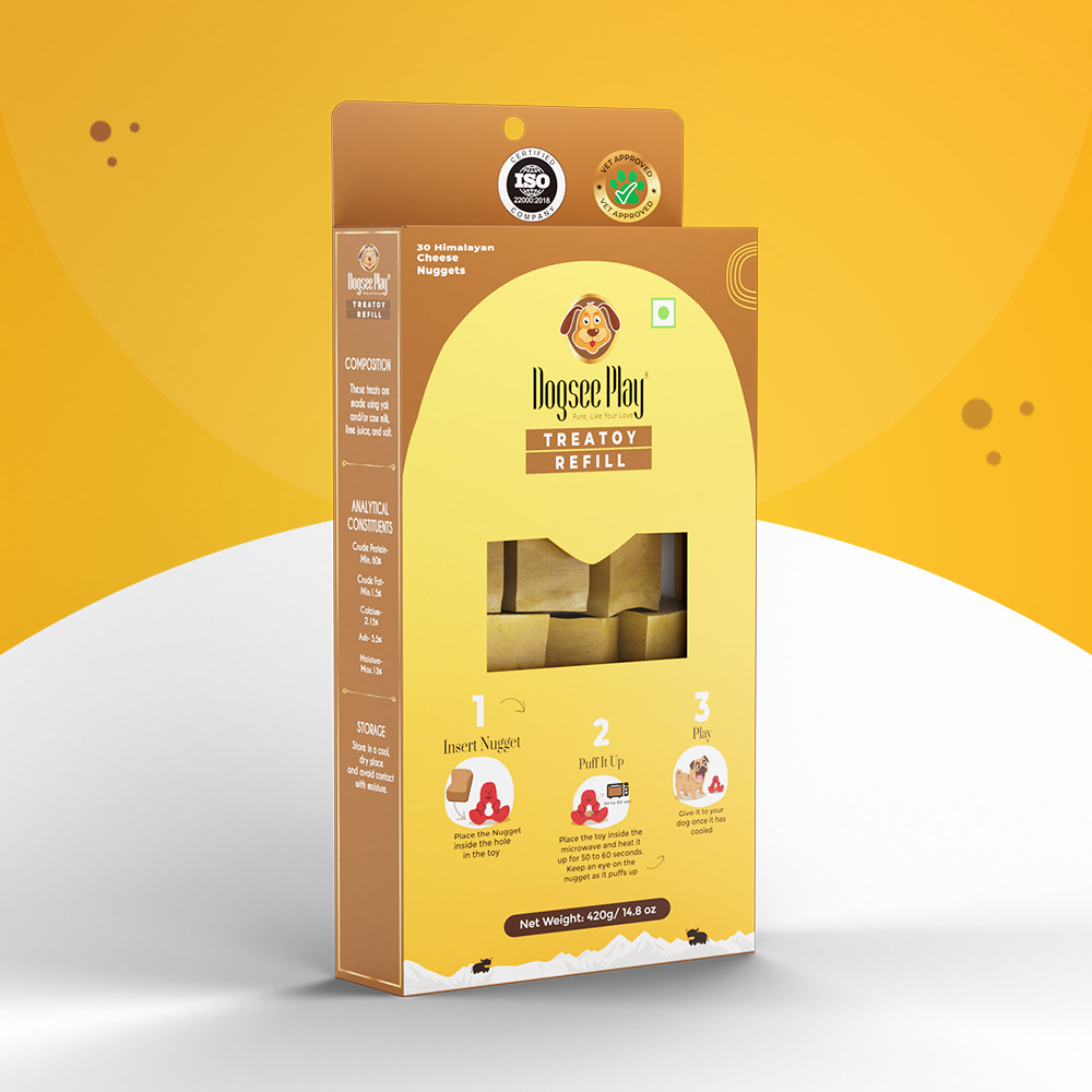 Place the delicious Himalayan cheese nugget inside the Treatoy cavity and microwave for 50-60 seconds to puff it up. Once cooled, give it to your dog and watch your pooch enjoy playing with the toy and cheese puff treat for hours.