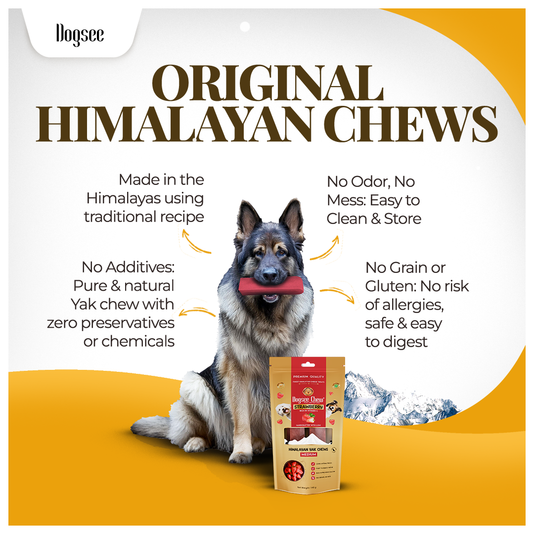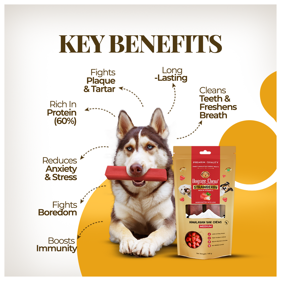 Strawberry Infused Yak Chews: Made from yak and cow milk, these medium chews are enhanced with real strawberry, offering a nutrient-rich, flavorful treat that supports your dog’s immune system naturally.