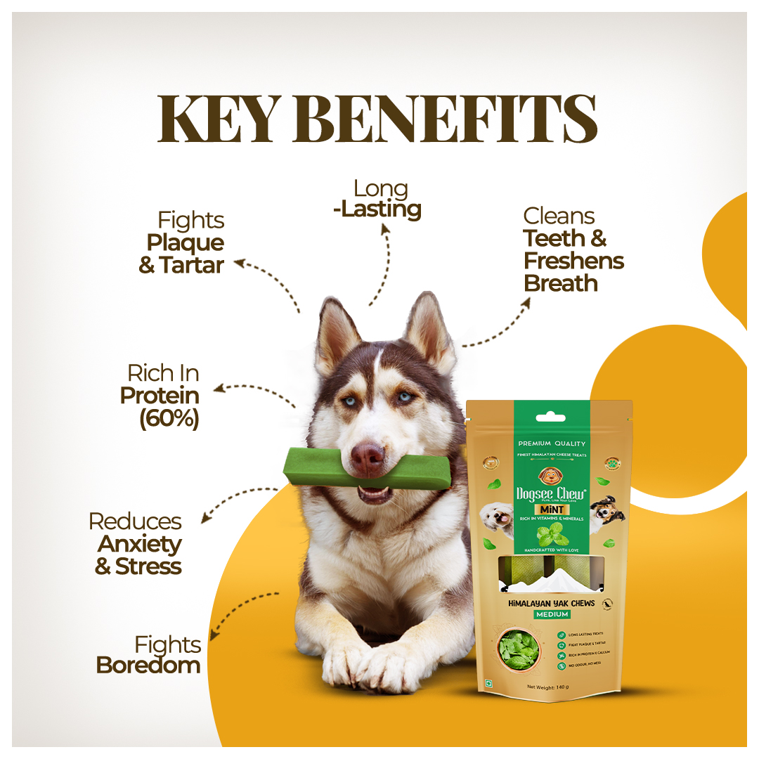 Natural Himalayan Yak Chews: Made with yak and cow milk, these chews are protein-rich and naturally nutritious. Infused with refreshing mint, they promote dental hygiene while satisfying your dog’s natural chewing instincts.