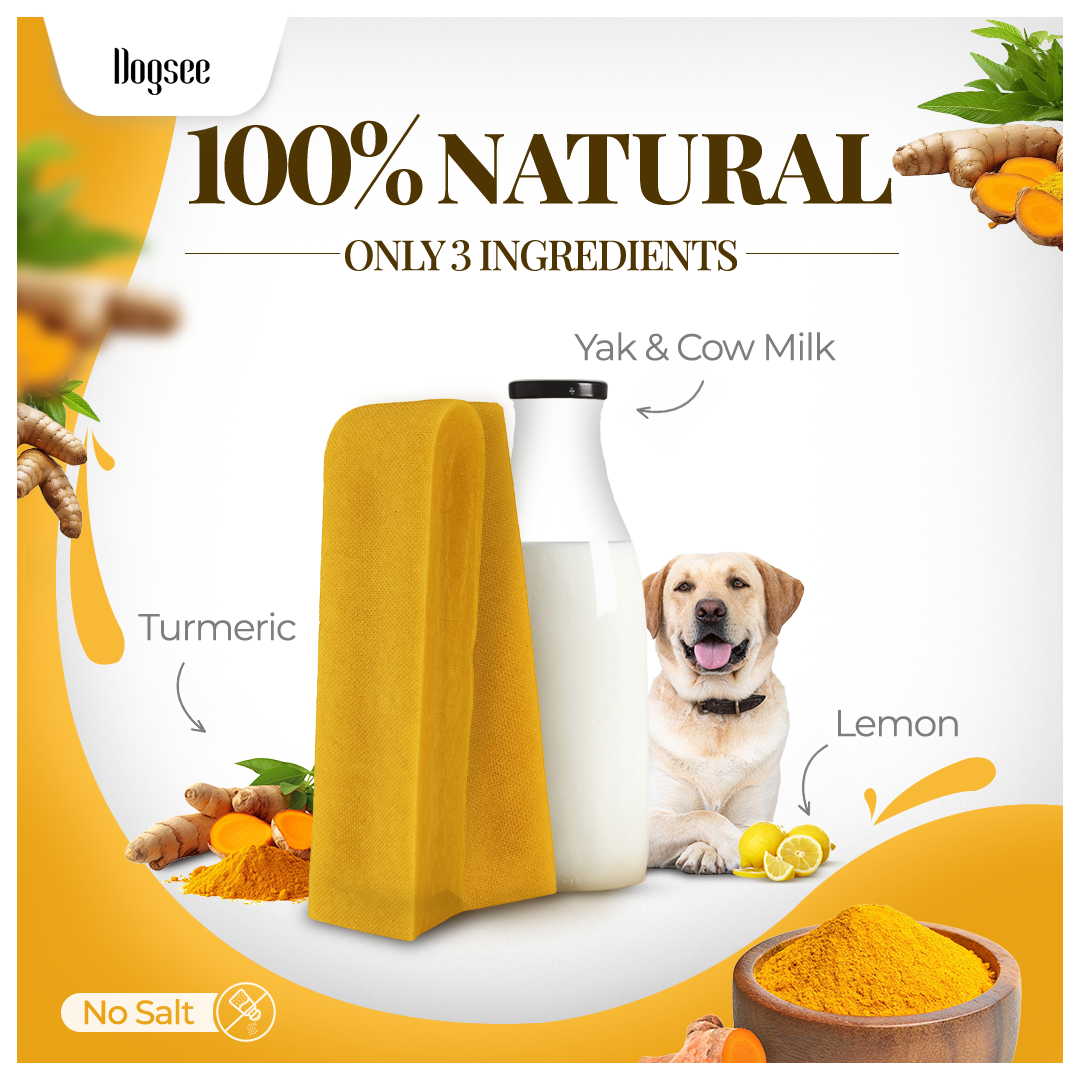 Natural Ingredients - These Turmeric flavoured Himalayan Yak cheese dog chews are hand-crafted using only natural ingredients - yak and cow milk, turmeric, lime juice, and loads of love. No artificial colors or preservatives.